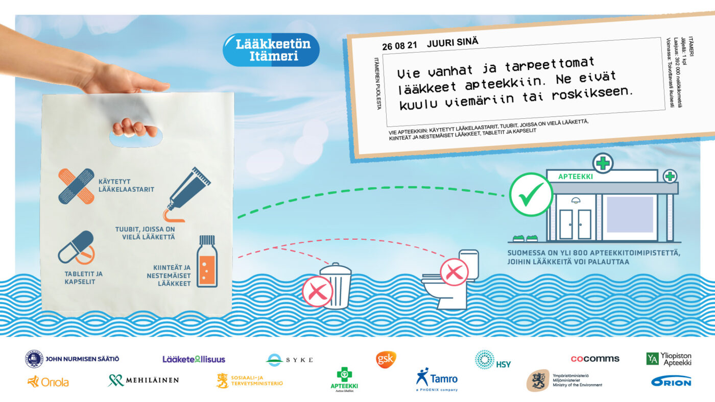 Helppo ja hyvin konkreettinen tapa huolehtia ympäristöstä on viedä vanhat ja tarpeettomat lääkkeet apteekkiin. Ne eivät kuulu viemäriin tai roskikseen, sillä sieltä ne voivat päätyä edelleen luontoon ja vesistöihin tai esimerkiksi lasten käsiin. Lue lisää http://laakkeetonitameri.fi/